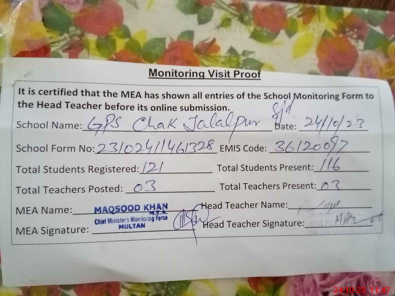 | Attendance Register | Head Teacher | MEA with School | Visit Proof |