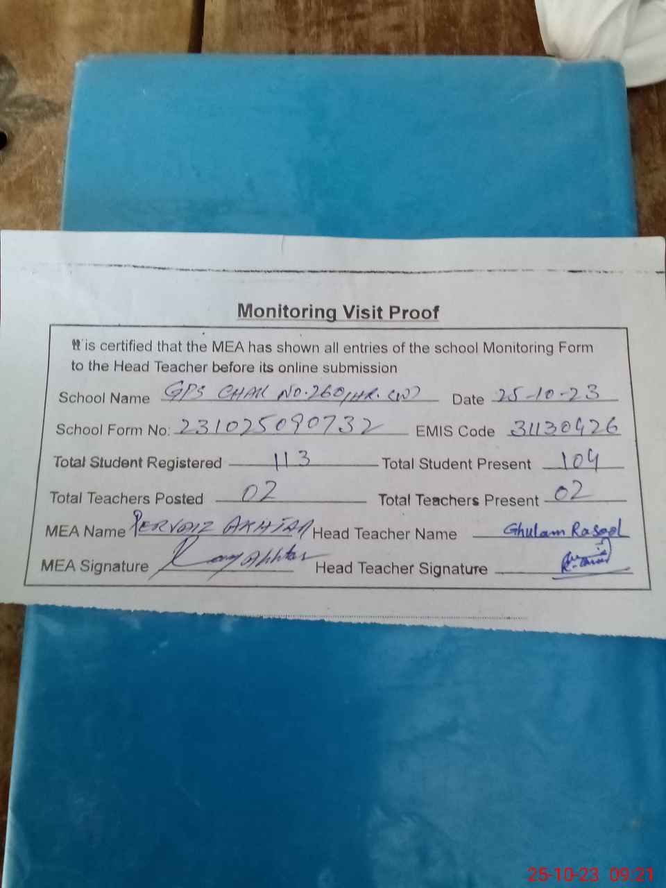 | Attendance Register | Head Teacher | MEA with School | Visit Proof |