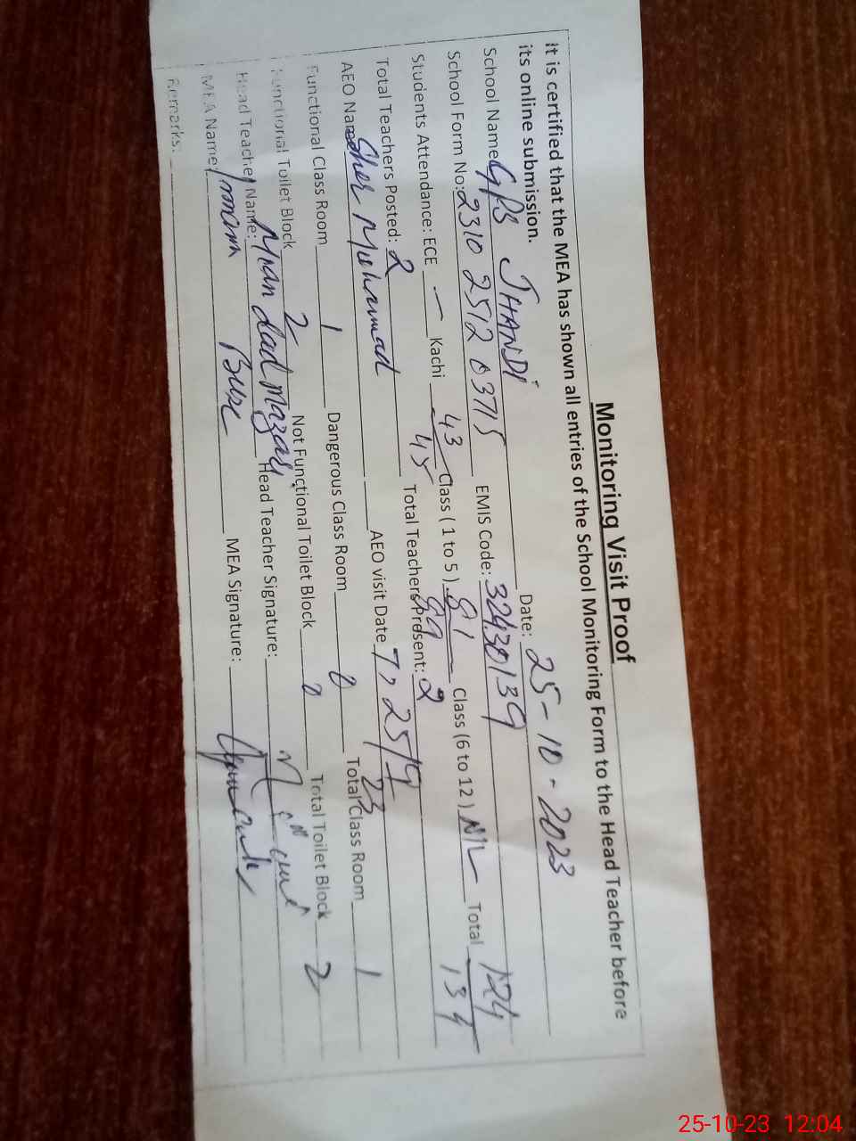 | Attendance Register | Head Teacher | MEA with School | Visit Proof |