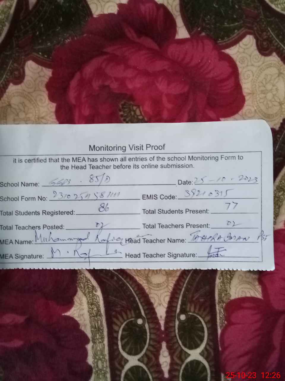 | Attendance Register | Head Teacher | MEA with School | Visit Proof |