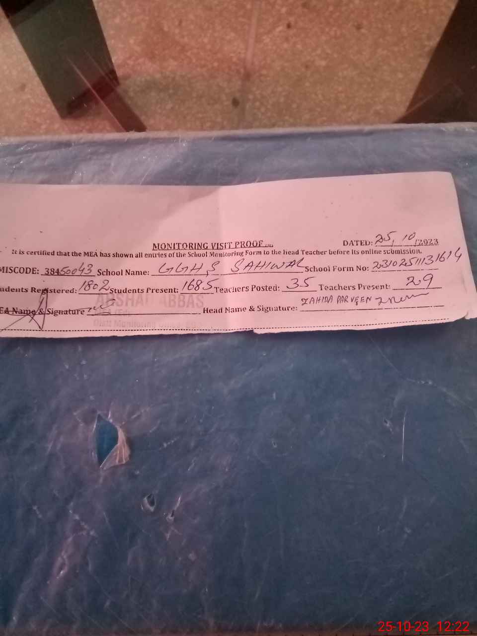 | EMIS Code: 38450043 | Name of School: GGHS SAHIWAL | |||