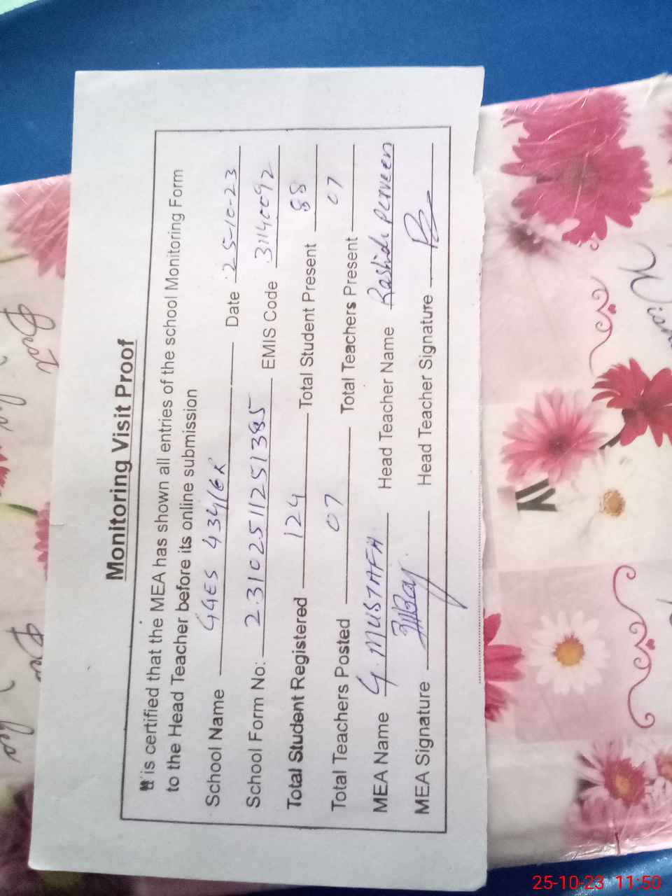 | Attendance Register | Head Teacher | MEA with School | Visit Proof |