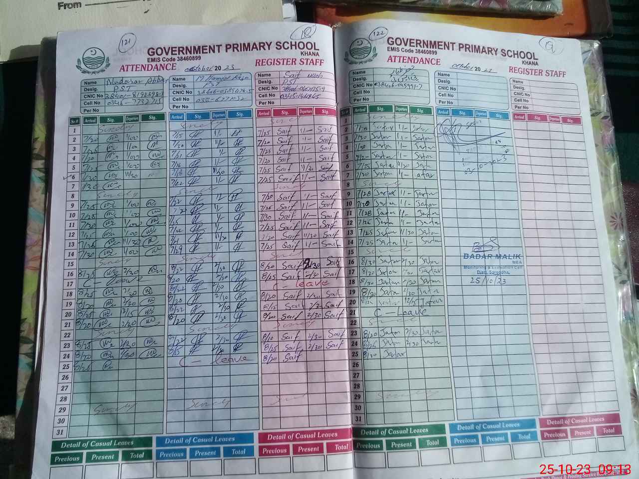 | CNIC | Full Name | Designation | R/C | Absence during last cal. month |