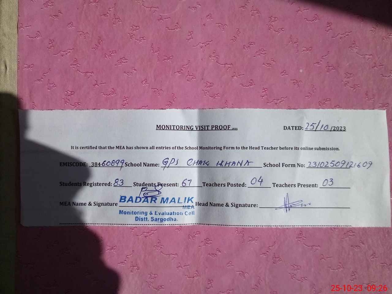 | Attendance Register | Head Teacher | MEA with School | Visit Proof |