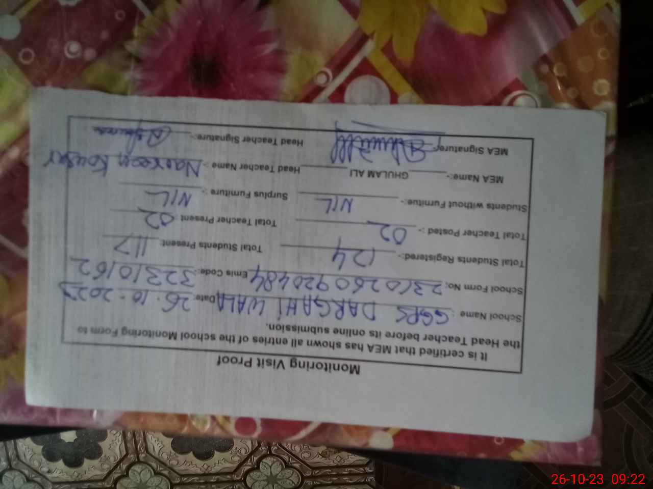 | Certified that this School was Inspected by the Undersigned MEA/DMO Today and the Information Stated Above is as Per Record. | |||||