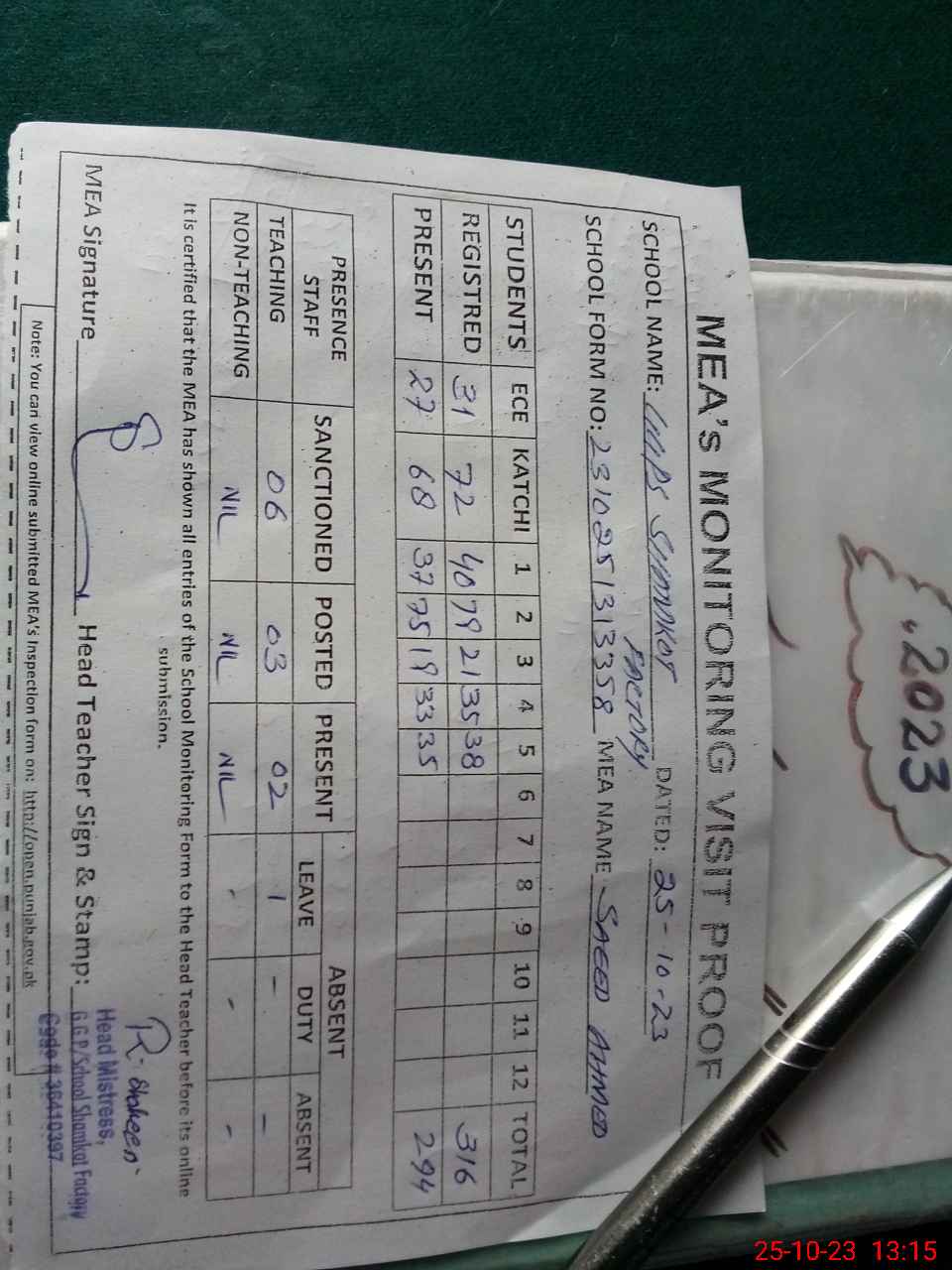 | Attendance Register | Head Teacher | MEA with School | Visit Proof |