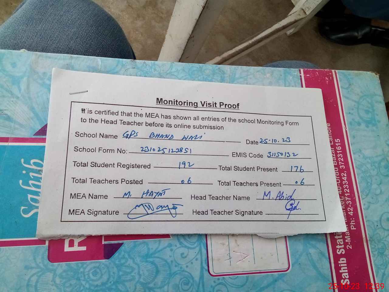 | EMIS Code: 31150132 | Name of School: GPS BHAND WALI | |||