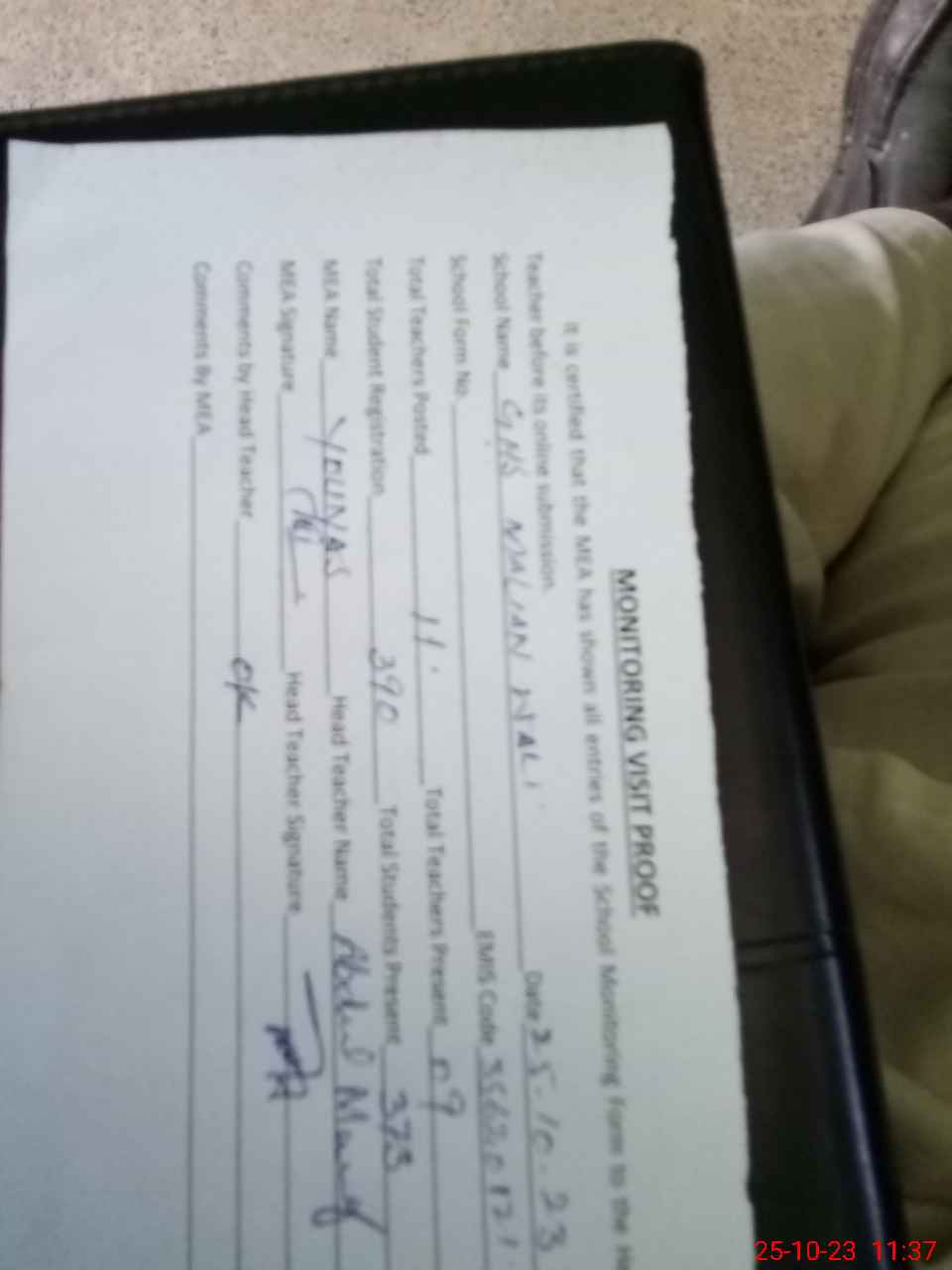 | Attendance Register | Head Teacher | MEA with School | Visit Proof |