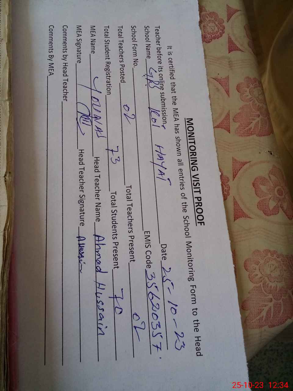 | EMIS Code: 35620357 | Name of School: GPS KOT HAYAT KHAN | |||
