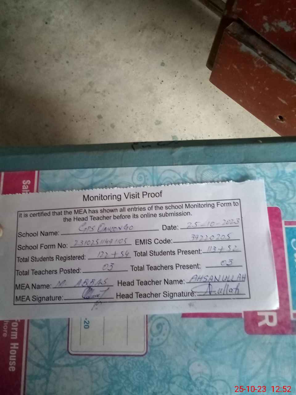 | Attendance Register | Head Teacher | MEA with School | Visit Proof |