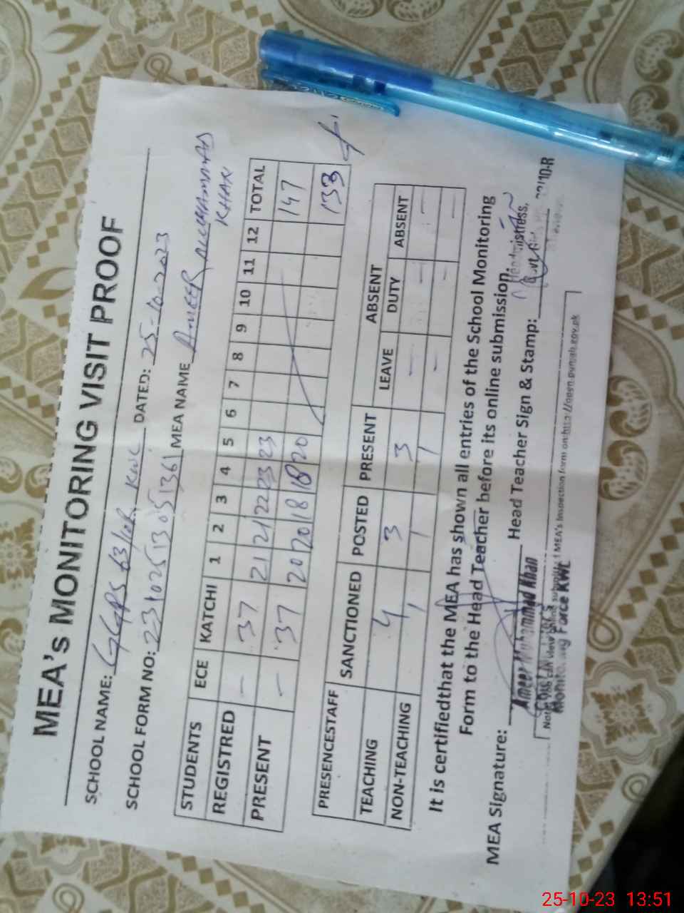 | Attendance Register | Head Teacher | MEA with School | Visit Proof |