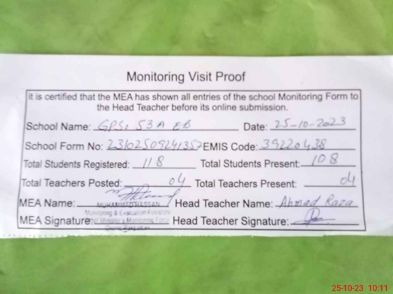 | EMIS Code: 39220438 | Name of School: GPS CHAK NO. 53 EB A | |||