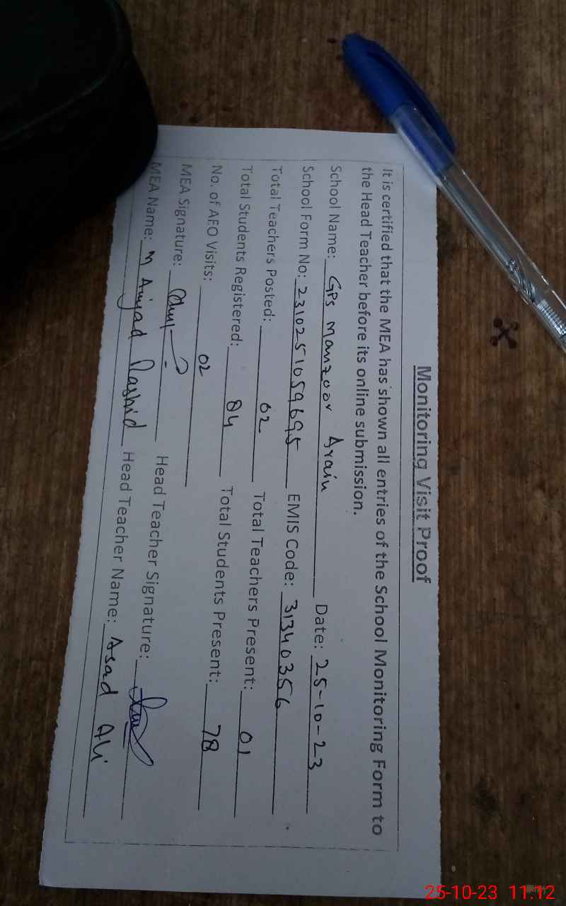 | Attendance Register | Head Teacher | MEA with School | Visit Proof |