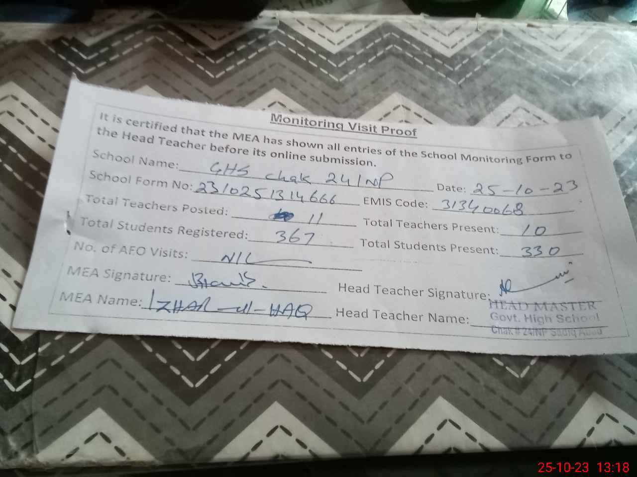 | EMIS Code: 31340068 | Name of School: GHS CHAK NO. 24 NP | |||