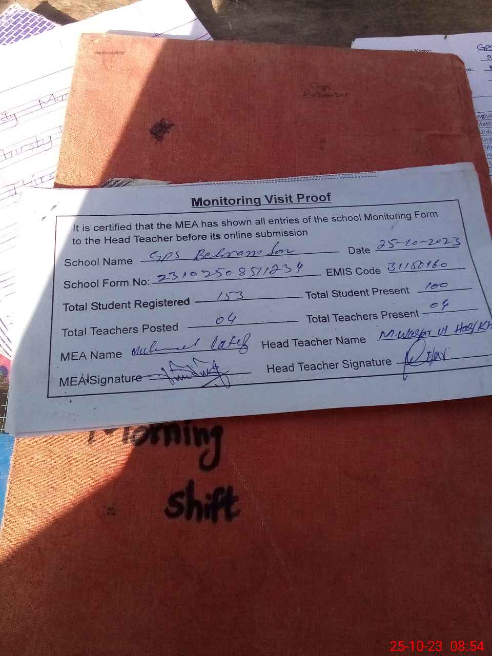 | EMIS Code: 31150160 | Name of School: GPS BEHRAAM SAR | |||