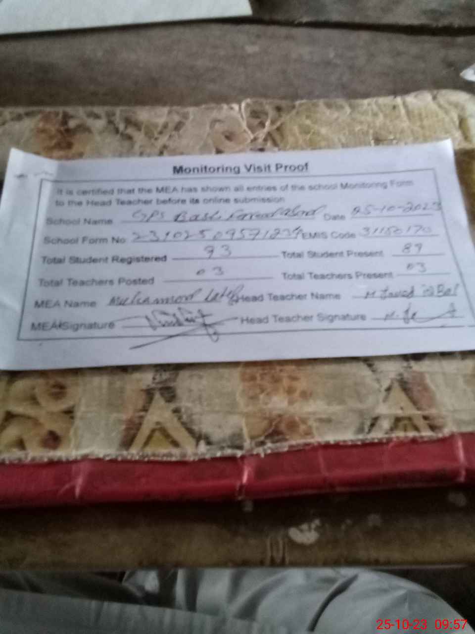 | Attendance Register | Head Teacher | MEA with School | Visit Proof |
