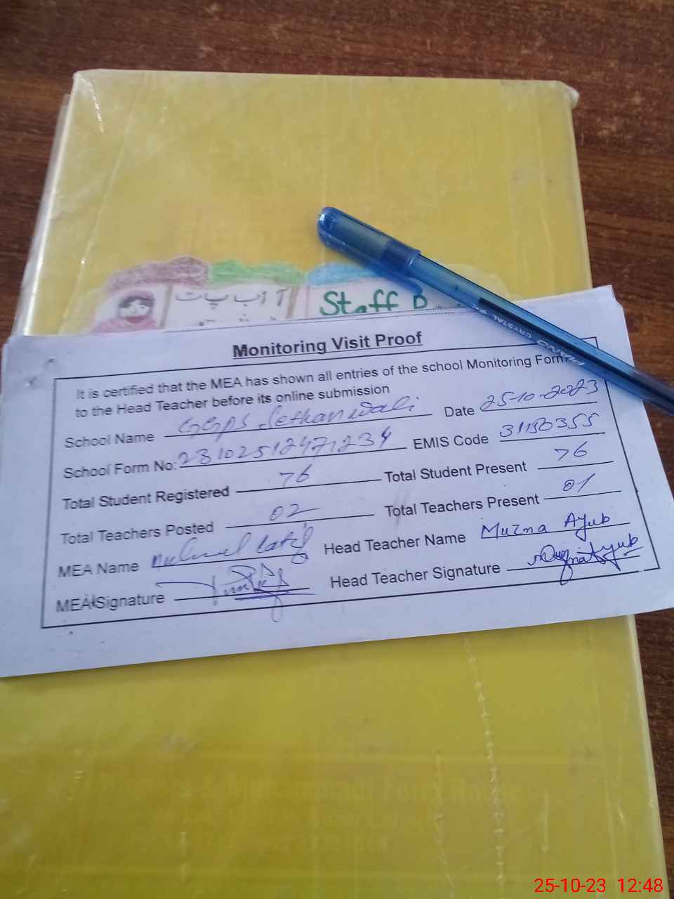 | Attendance Register | Head Teacher | MEA with School | Visit Proof |