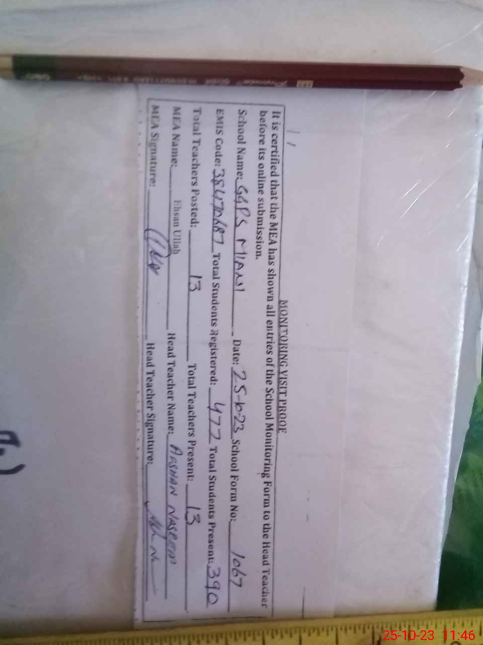 | Certified that this School was Inspected by the Undersigned MEA/DMO Today and the Information Stated Above is as Per Record. | |||||