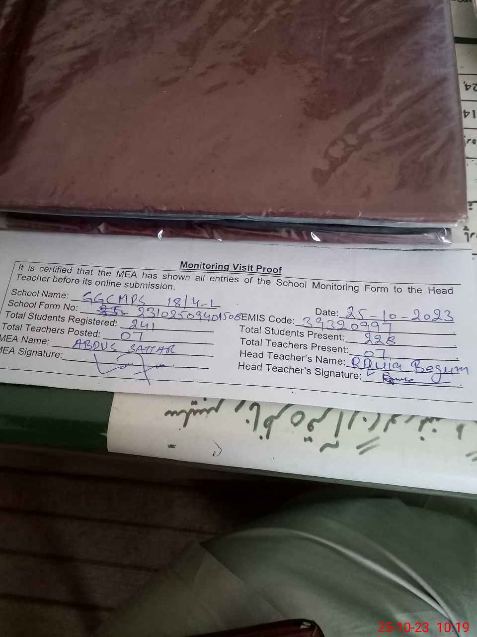 | Attendance Register | Head Teacher | MEA with School | Visit Proof |