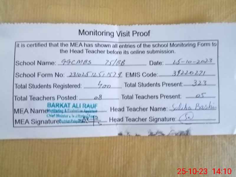 | Certified that this School was Inspected by the Undersigned MEA/DMO Today and the Information Stated Above is as Per Record. | |||||