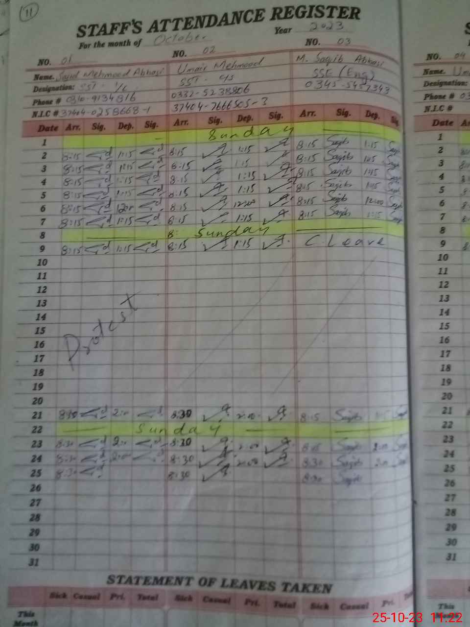| CNIC | Full Name | Designation | R/C | Absence During Last Calender Month |