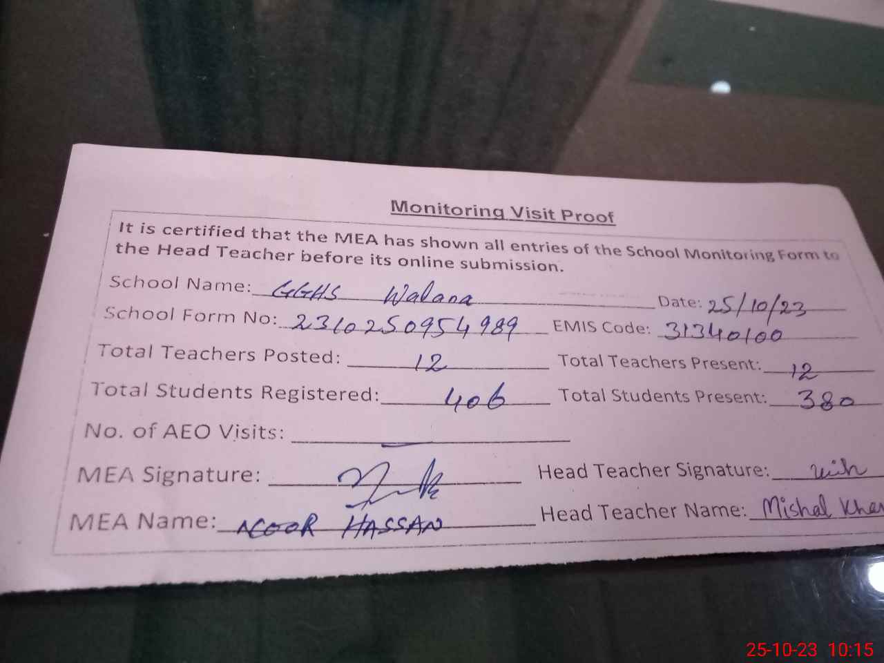 | Attendance Register | Head Teacher | MEA with School | Visit Proof |