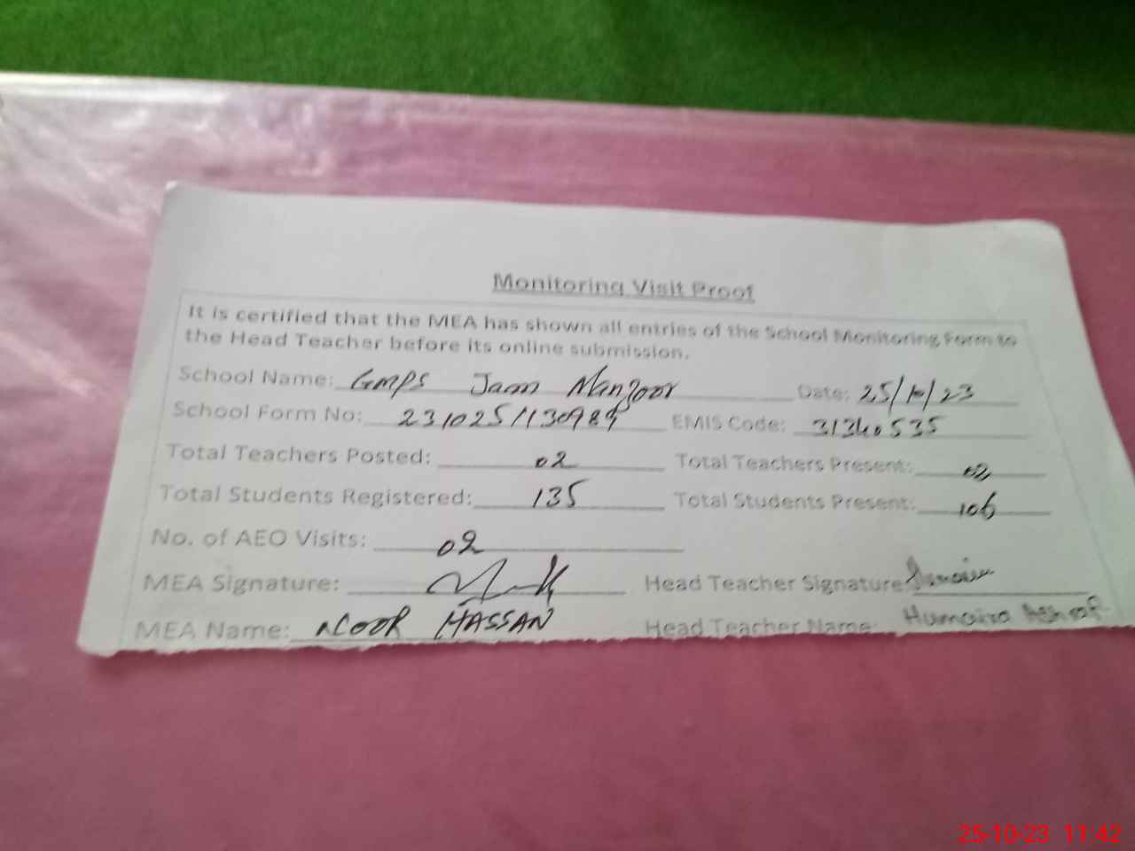 | Attendance Register | Head Teacher | MEA with School | Visit Proof |