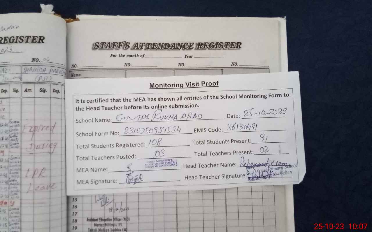 | Attendance Register | Head Teacher | MEA with School | Visit Proof |