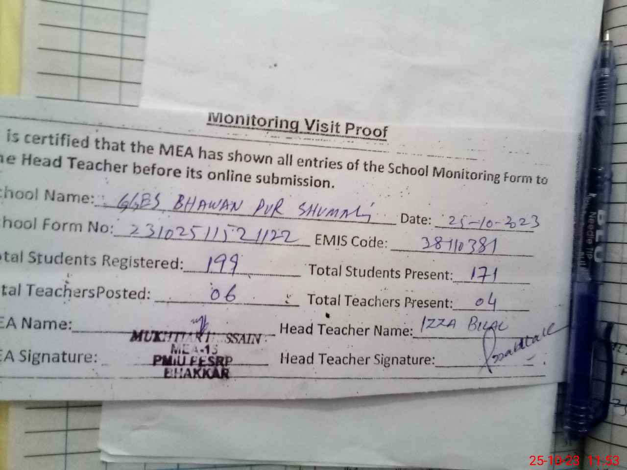 | Attendance Register | Head Teacher | MEA with School | Visit Proof |