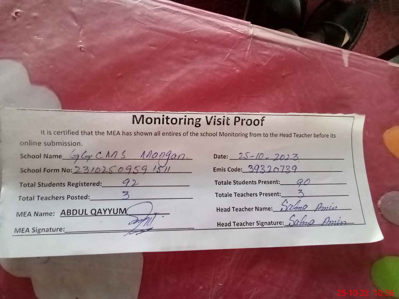 | Attendance Register | Head Teacher | MEA with School | Visit Proof |
