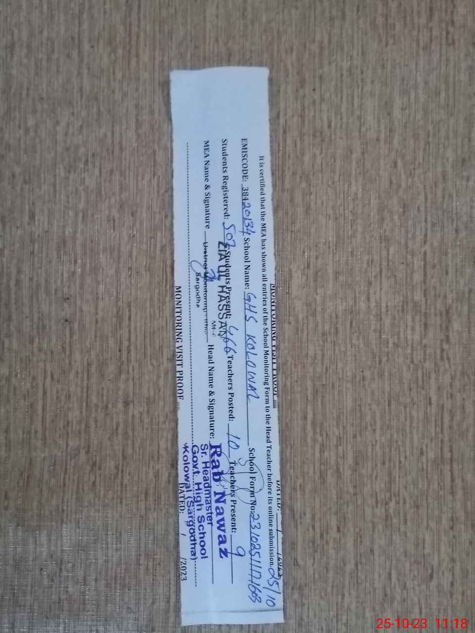 | Monitoring Date: 25-10-2023 | Start Time: 25-10-2023 10:28 AM | End Time: 25-10-2023 11:19 AM | Name of MEA: ZI**** ULHA**** | |