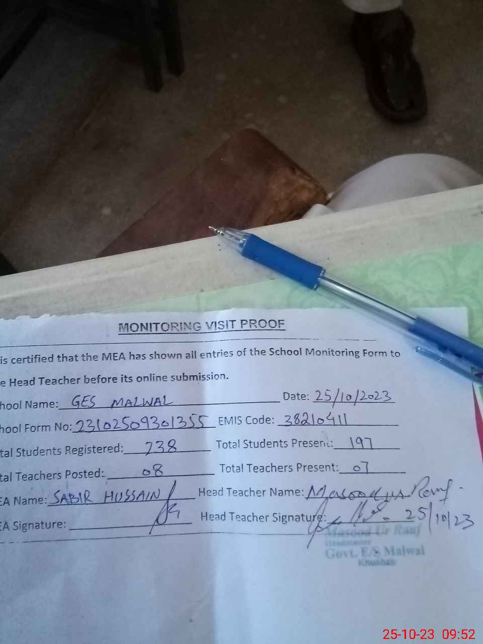 | Attendance Register | Head Teacher | MEA with School | Visit Proof |