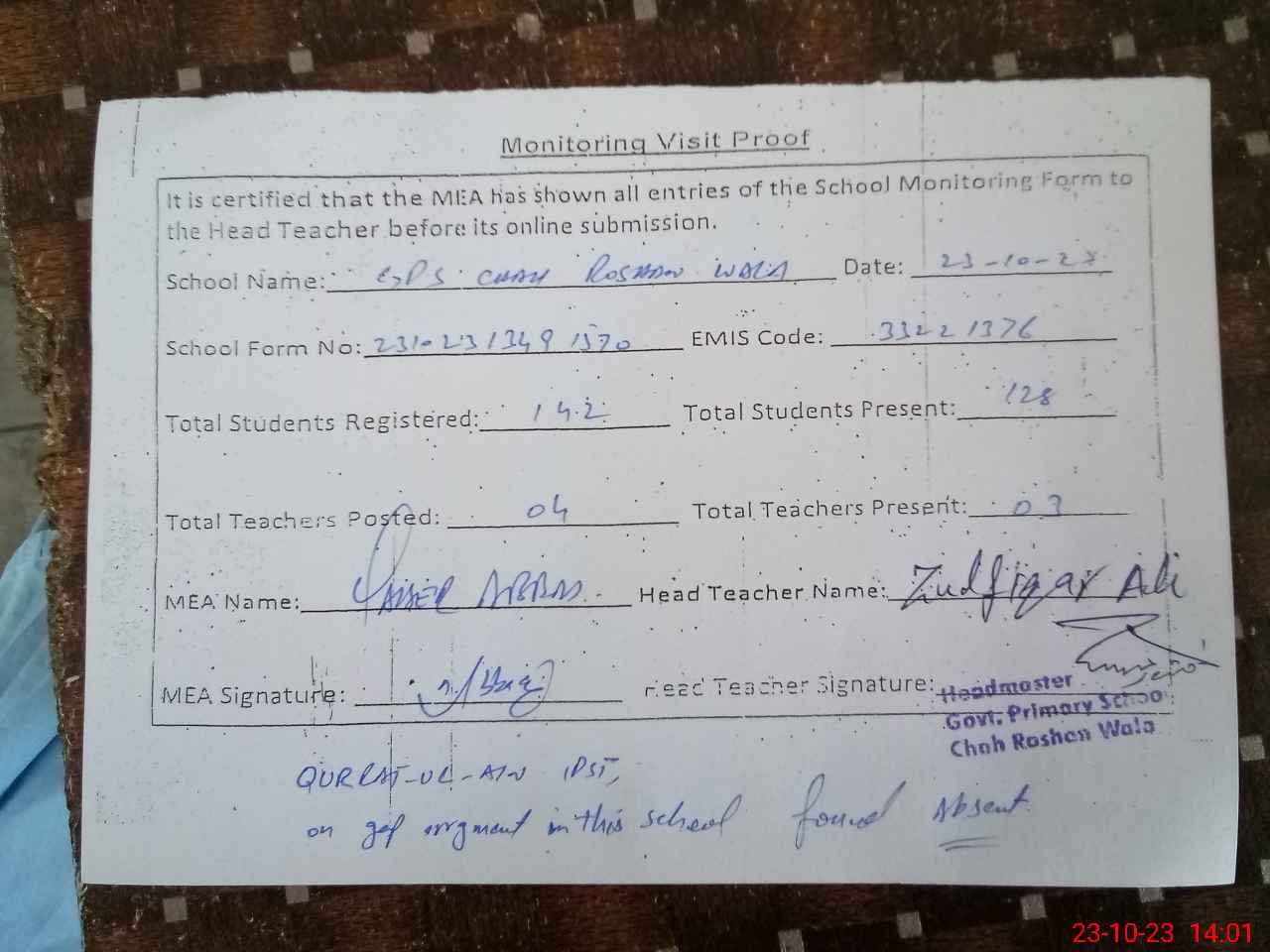 | EMIS Code: 33221376 | Name of School: GPS CHAH ROSHAN WALA | |||
