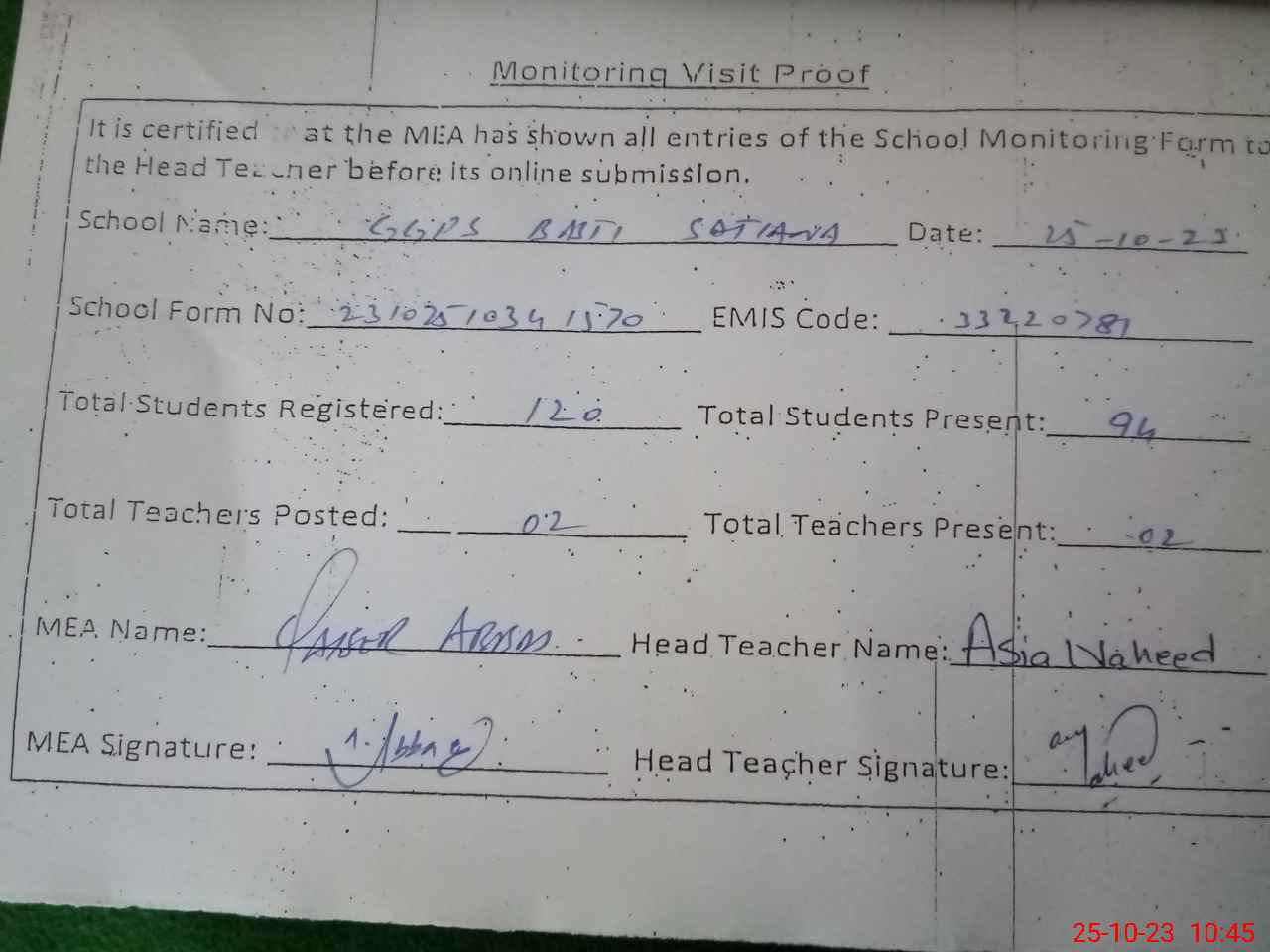 | Attendance Register | Head Teacher | MEA with School | Visit Proof |