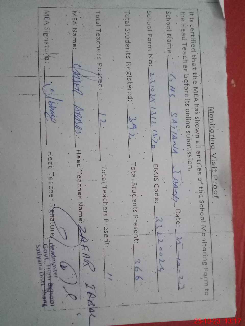 | Attendance Register | Head Teacher | MEA with School | Visit Proof |