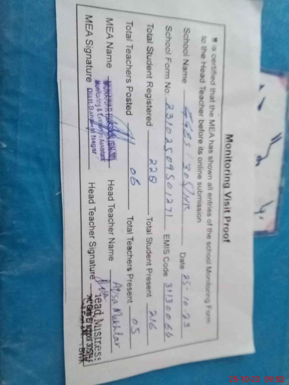 | Certified that this School was Inspected by the Undersigned MEA/DMO Today and the Information Stated Above is as Per Record. | |||||