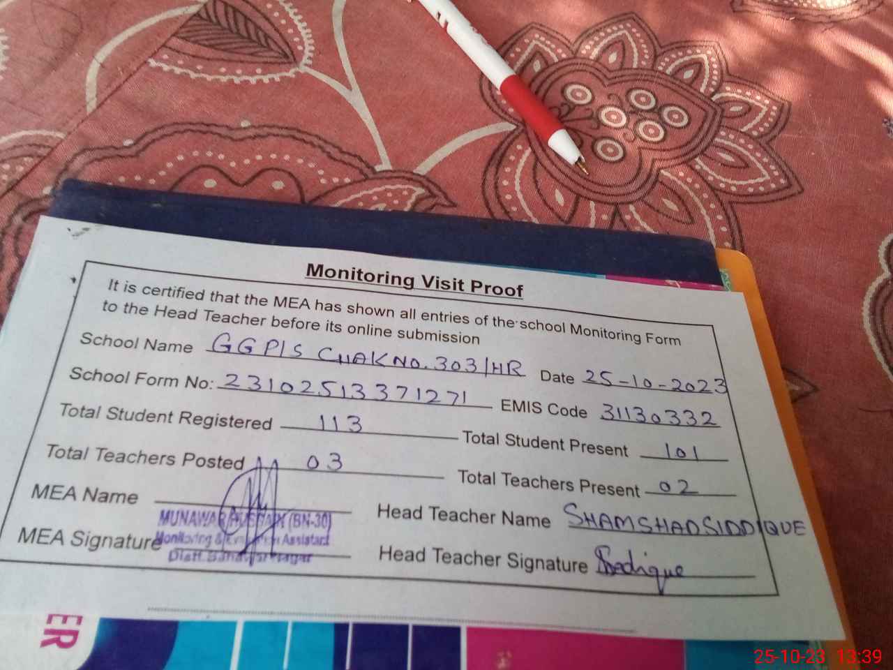 | Attendance Register | Head Teacher | MEA with School | Visit Proof |