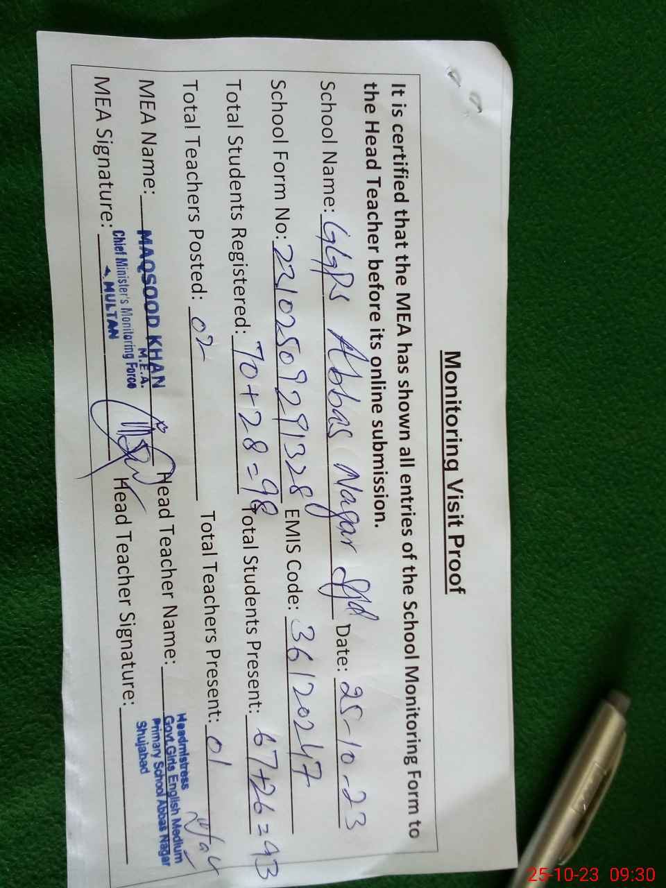 | EMIS Code: 36120247 | Name of School: GGPS ABBAS NAGAR MUZA JALALPUR KHAKHI | |||