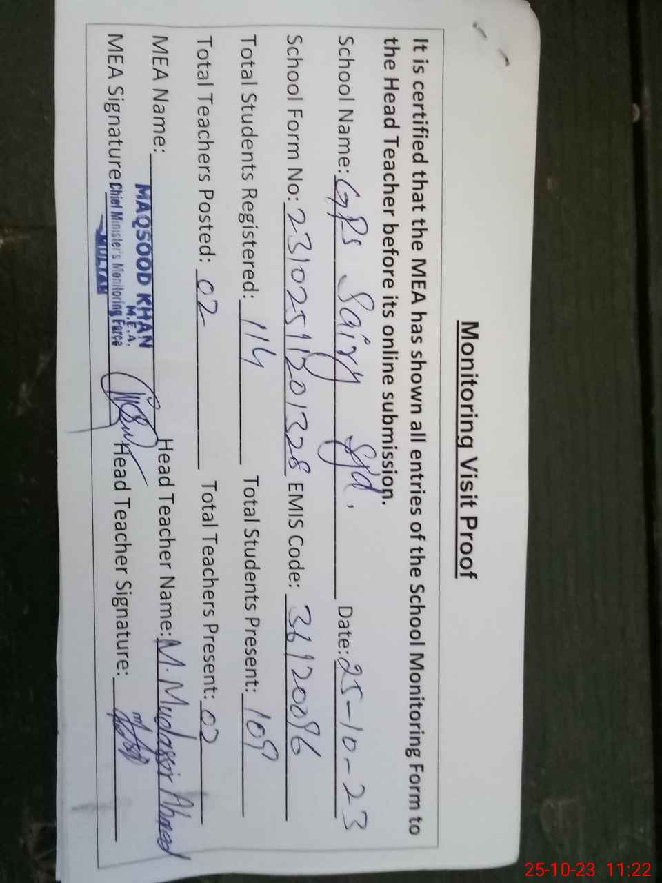 | EMIS Code: 36120096 | Name of School: GPS SAIRY P/O JALAL PUR KHAKHI | |||