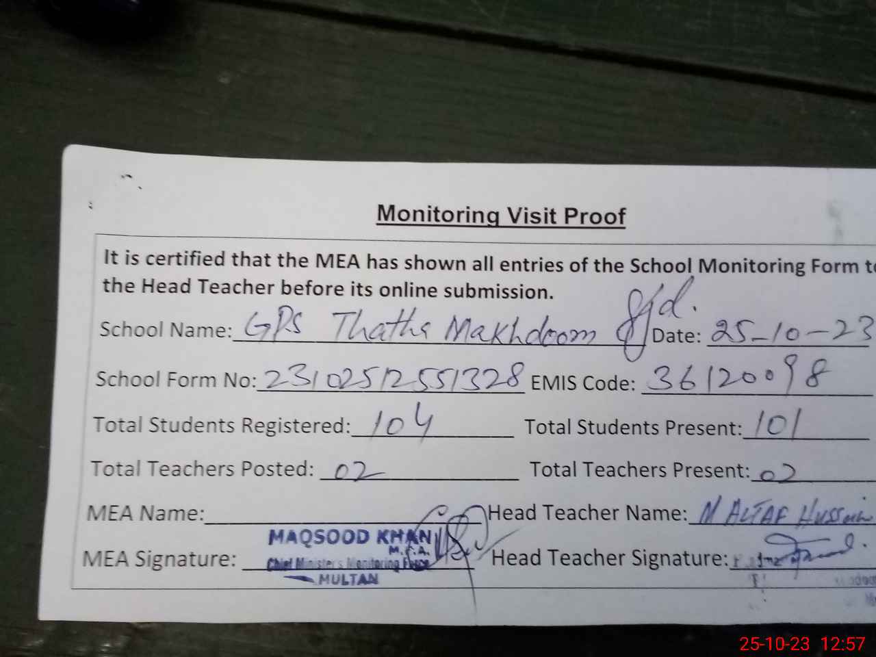 | Attendance Register | Head Teacher | MEA with School | Visit Proof |