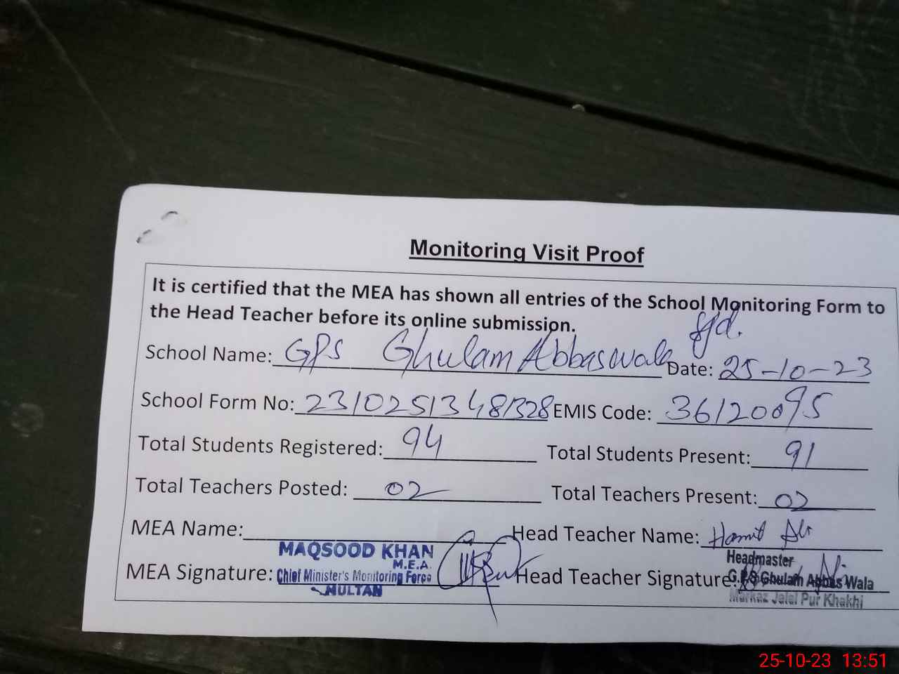 | Attendance Register | Head Teacher | MEA with School | Visit Proof |