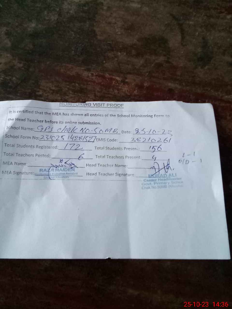 | Attendance Register | Head Teacher | MEA with School | Visit Proof |
