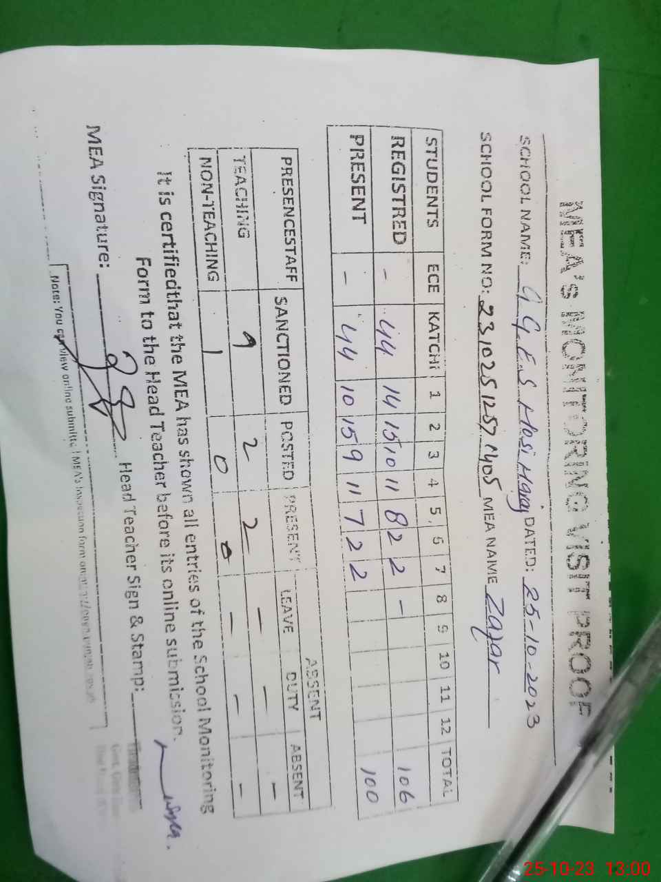 | Attendance Register | Head Teacher | MEA with School | Visit Proof |