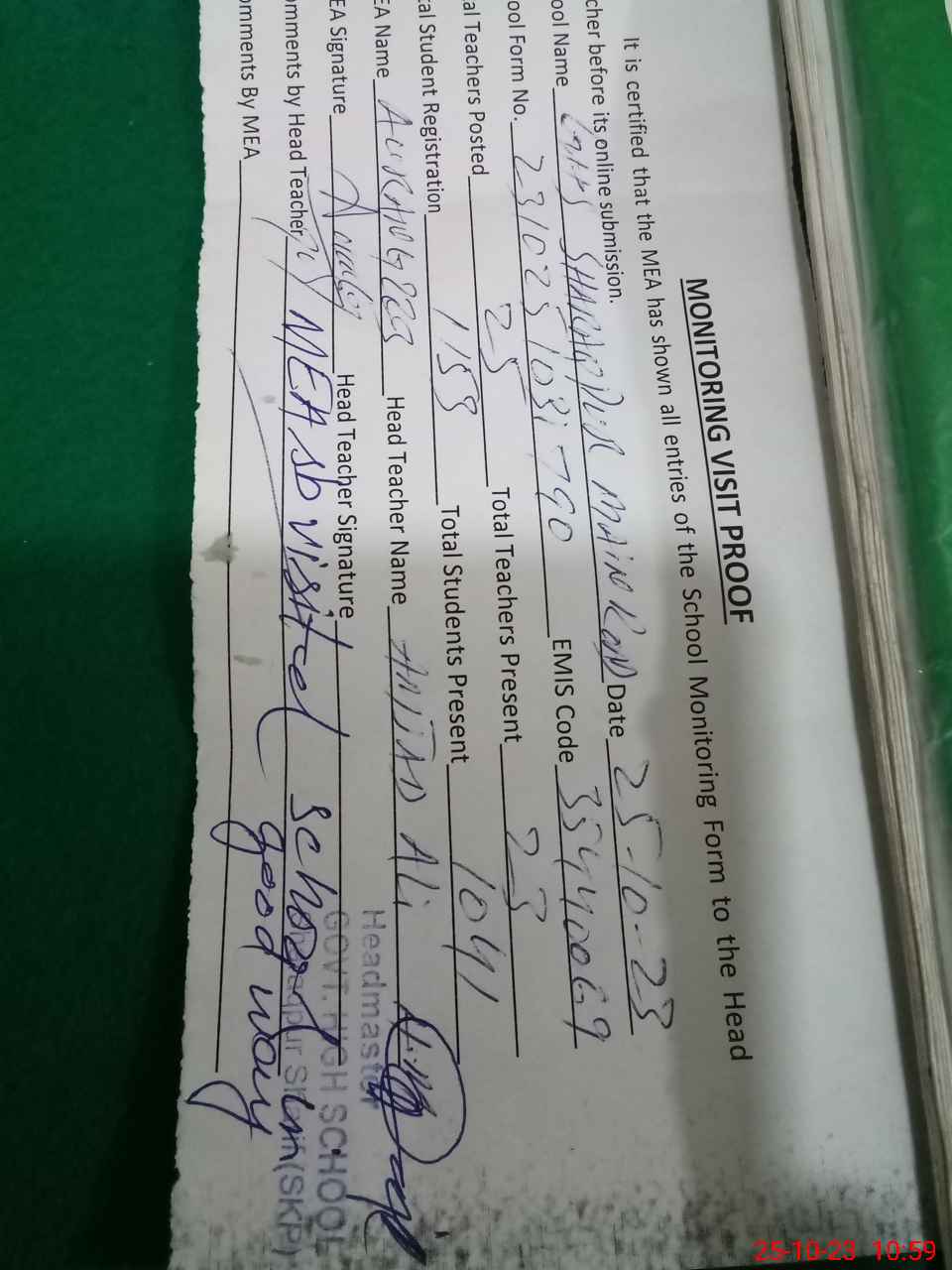 | Attendance Register | Head Teacher | MEA with School | Visit Proof |