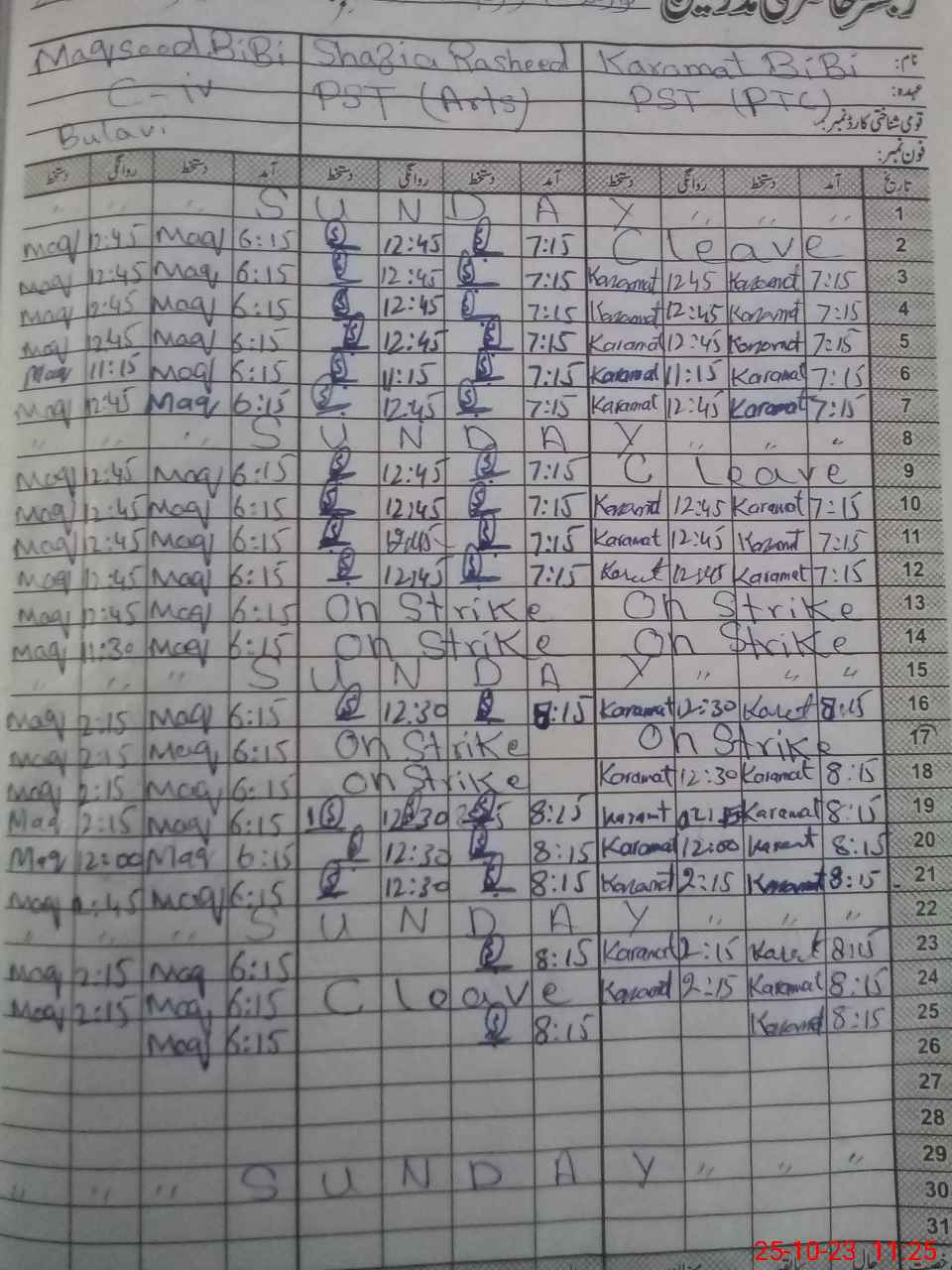 | CNIC | Full Name | Designation | R/C | Absence During Last Calender Month |