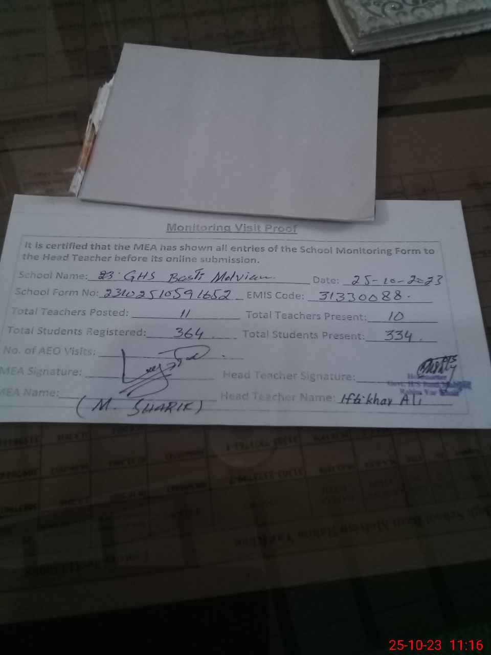 | Monitoring Date: 25-10-2023 | Start Time: 25-10-2023 10:25 AM | End Time: 25-10-2023 11:18 AM | Name of MEA: Mu**** Sh**** | |