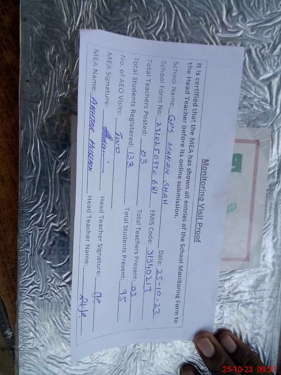 | Attendance Register | Head Teacher | MEA with School | Visit Proof |