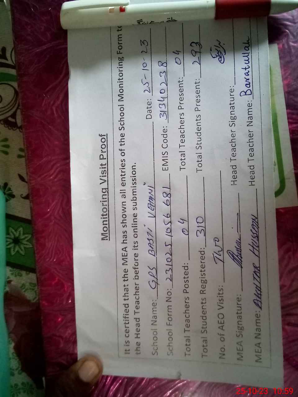 | Attendance Register | Head Teacher | MEA with School | Visit Proof |