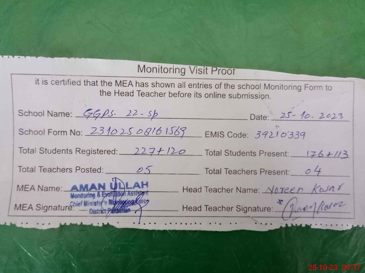 | Attendance Register | Head Teacher | MEA with School | Visit Proof |