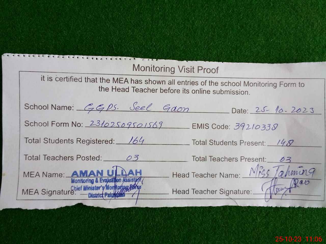 | Attendance Register | Head Teacher | MEA with School | Visit Proof |
